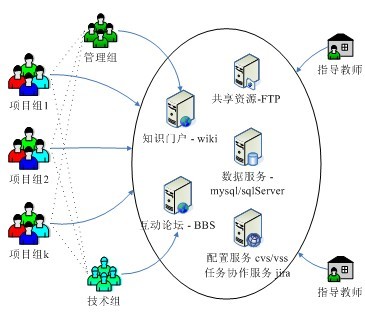 實訓支撐環境主要由知識管理工具(Wiki/BBS)、資源共享工具(FTP)和團隊軟件生產協作工具(svn/jira/database)等構成。FTP實現資源的積累,Wiki編織各種資源形成知識門戶。利用Wiki建立項目指導網站,描述了項目背景、業務要求、項目里程碑、關鍵制品及生產指南、技術培訓資料等。在項目中,發布團隊在管理、分析與設計中產生的最佳實踐,促進知識傳播。