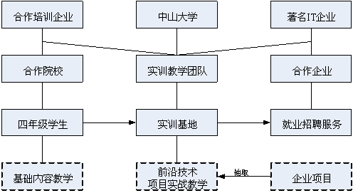 合作院校和企業提供有一定基礎的生源,中山大學聯合著名跨國IT企業提供IT前沿技術課程和實訓,相關合作企業獲得優質生源。
