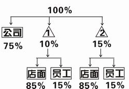二級加盟店每發展一家三級加盟店,按加盟費0.75:0.10:0.15比例分配;