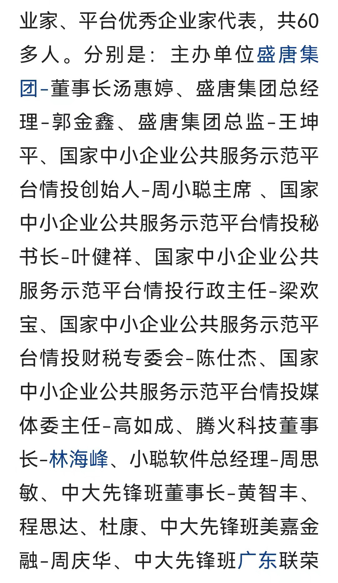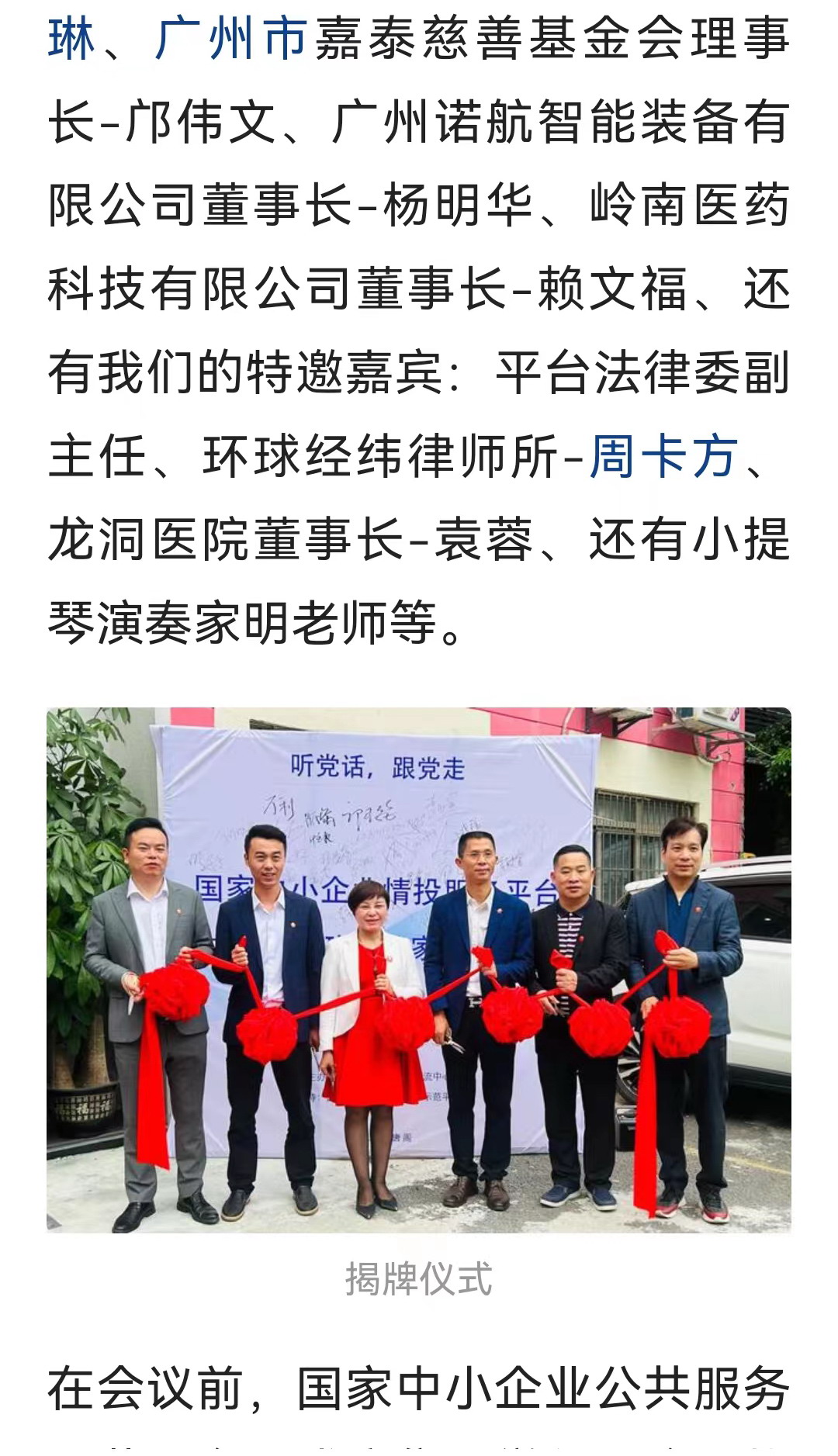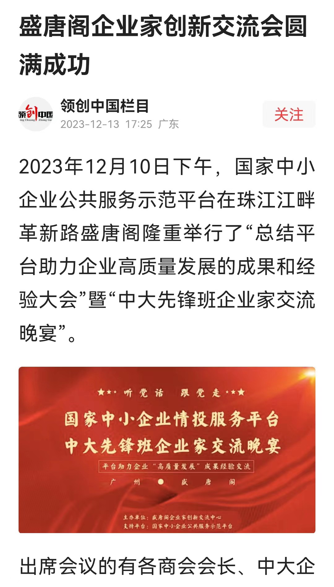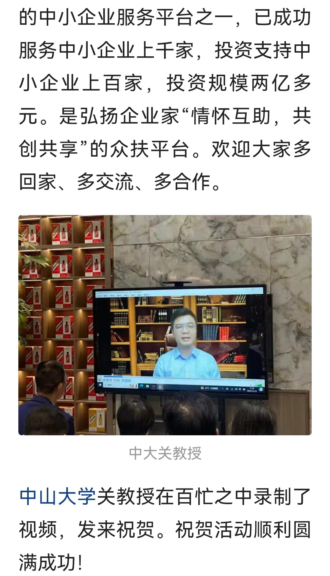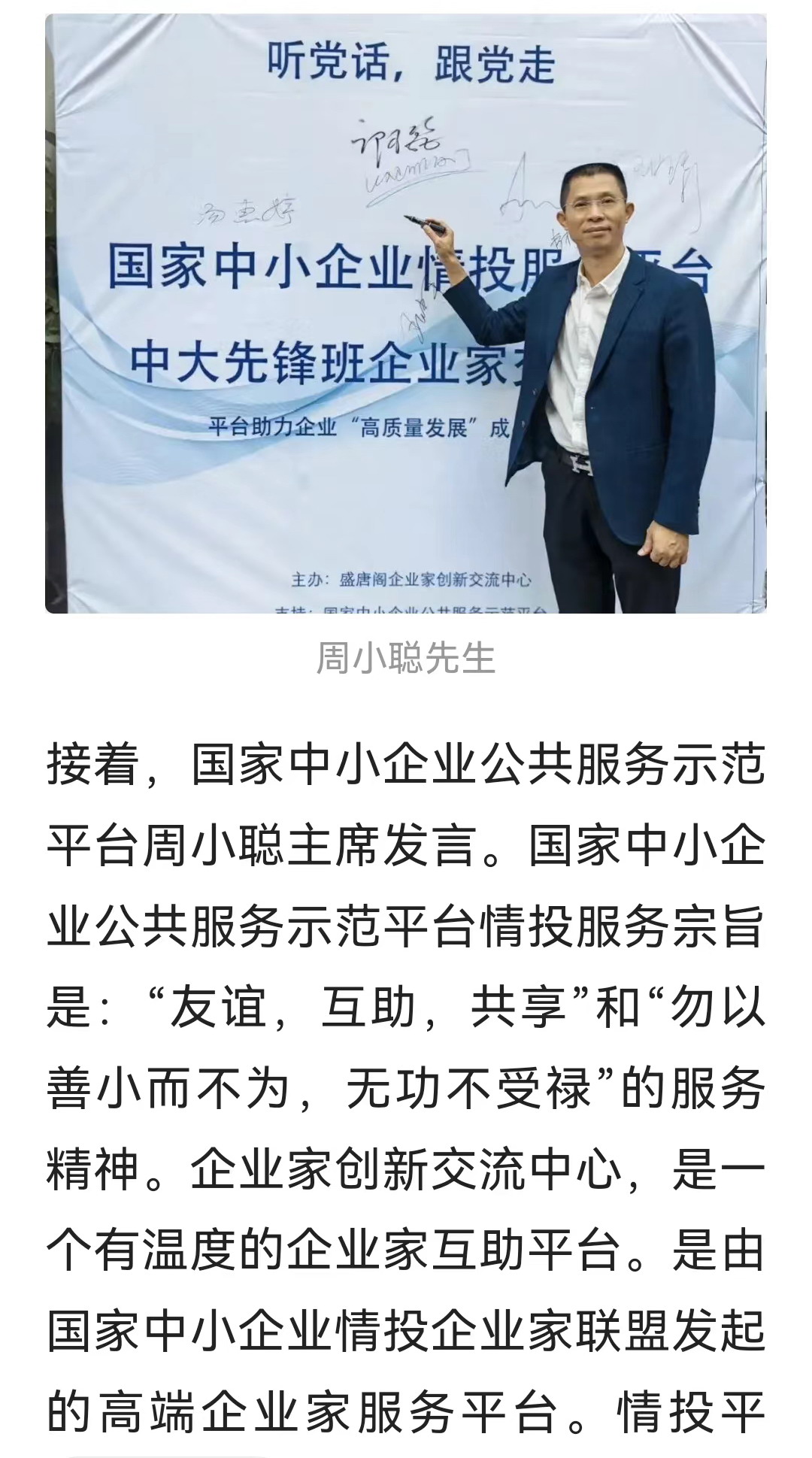 歡迎(ying)大(da)家相(xiang)聚在美麗(li)的盛唐閣(ge)企(qi)(qi)(qi)(qi)業(ye)家創新交流中(zhong)心,出席國家中(zhong)小企(qi)(qi)(qi)(qi)業(ye)情投服務平臺、中(zhong)大(da)先鋒班企(qi)(qi)(qi)(qi)業(ye)家交流晚(wan)宴,總結(jie)平臺助力企(qi)(qi)(qi)(qi)業(ye)“高質量發(fa)展”的成果和經驗。 秉承(cheng)國家(jia)中(zhong)小(xiao)企(qi)(qi)(qi)業公(gong)共服務(wu)(wu)示范平(ping)臺情投服務(wu)(wu)宗旨“友誼,互助(zhu),共享”和(he)“勿以善小(xiao)而不(bu)為,無功不(bu)受祿”的服務(wu)(wu)精神,企(qi)(qi)(qi)業家(jia)創(chuang)新交流中(zhong)心(xin),是一個有溫度的企(qi)(qi)(qi)業家(jia)互助(zhu)平(ping)臺。是由國家(jia)中(zhong)小(xiao)企(qi)(qi)(qi)業情投企(qi)(qi)(qi)業家(jia)聯盟發起的高端企(qi)(qi)(qi)業家(jia)服務(wu)(wu)平(ping)臺。 情(qing)投(tou)平(ping)臺(tai)(tai)(tai),是經國(guo)家(jia)工信部授牌的(de)國(guo)家(jia)中(zhong)小企(qi)(qi)業(ye)公共(gong)服(fu)務示范平(ping)臺(tai)(tai)(tai),是2014年當批廣東(dong)省兩家(jia)國(guo)家(jia)認定的(de)中(zhong)小企(qi)(qi)業(ye)服(fu)務平(ping)臺(tai)(tai)(tai)之一,已成(cheng)功服(fu)務中(zhong)小企(qi)(qi)業(ye)上(shang)千家(jia),投(tou)資(zi)支持中(zhong)小企(qi)(qi)業(ye)上(shang)百家(jia),投(tou)資(zi)規(gui)模兩億多元(yuan)。是弘揚企(qi)(qi)業(ye)家(jia)“情(qing)懷互(hu)助,共(gong)創共(gong)享(xiang)”的(de)眾扶平(ping)臺(tai)(tai)(tai)。 今天很高興和在座的(de)領導、各商會會長(chang)、中大(da)(da)企業(ye)家和嘉賓朋友們一(yi)起(qi)在盛(sheng)唐閣(ge)成立了企業(ye)家創新交流中心,交流中心是(shi)企業(ye)家的(de)家,歡迎(ying)大(da)(da)家多回(hui)家、喝茶交流與(yu)合作。 再次祝賀盛唐企業家創新交流中心(xin)隆重成立!祝大(da)家度過一個(ge)愉快(kuai)有收獲的周(zhou)日晚上。 此致(zhi) 敬(jing)禮! 情(qing)投(tou)平臺主席、小(xiao)聰軟件董事長(chang):周(zhou)小(xiao)聰先生(sheng)致辭(ci) 2023年12月10日(ri)