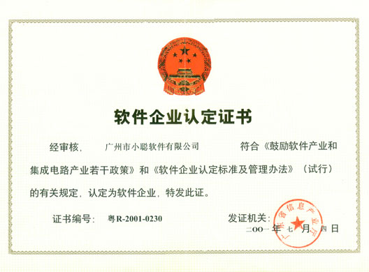 2001年7月4日廣州市小聰軟件有限公司被廣東省信息產業廳認定為軟件企業,并頒發軟件企業認定證書