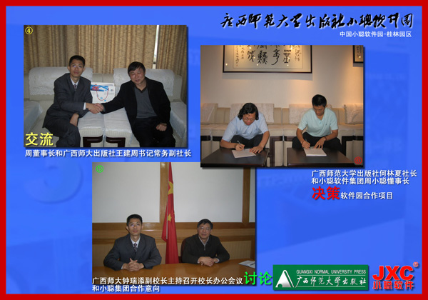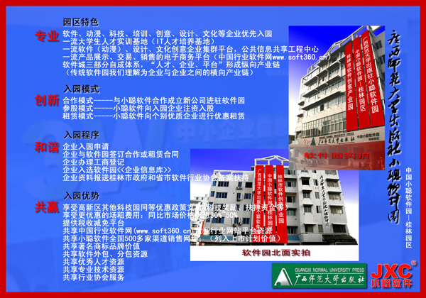 廣西(xi)(xi)師范(fan)(fan)大(da)學(xue)出(chu)版社(she)小(xiao)(xiao)(xiao)聰(cong)軟(ruan)(ruan)件(jian)(jian)(jian)園(yuan)(yuan)(以(yi)下(xia)稱“軟(ruan)(ruan)件(jian)(jian)(jian)園(yuan)(yuan)”)為(wei)廣西(xi)(xi)師范(fan)(fan)大(da)學(xue)出(chu)版與廣州市(shi)小(xiao)(xiao)(xiao)聰(cong)軟(ruan)(ruan)件(jian)(jian)(jian)有限公司合作(zuo)成(cheng)立(li)的(de)(de)(de)(de)國(guo)家(jia)級高科技軟(ruan)(ruan)件(jian)(jian)(jian)園(yuan)(yuan),是小(xiao)(xiao)(xiao)聰(cong)軟(ruan)(ruan)件(jian)(jian)(jian)園(yuan)(yuan)向全(quan)國(guo)發(fa)展過程中(zhong)(zhong)邁出(chu)的(de)(de)(de)(de)重要(yao)一(yi)步(bu),合作(zuo)方廣西(xi)(xi)師范(fan)(fan)大(da)學(xue)出(chu)版社(she)1986年11月成(cheng)立(li)于(yu)歷(li)史(shi)文(wen)(wen)化名(ming)(ming)城桂(gui)林,為(wei)一(yi)家(jia)富于(yu)人文(wen)(wen)精神和創(chuang)(chuang)新精神、具有較(jiao)大(da)國(guo)際影響(xiang)的(de)(de)(de)(de)名(ming)(ming)社(she)強社(she)為(wei)傳(chuan)播中(zhong)(zhong)外(wai)優(you)秀(xiu)文(wen)(wen)明成(cheng)果、傳(chuan)承(cheng)人類先(xian)進文(wen)(wen)化作(zuo)出(chu)了重大(da)貢獻。小(xiao)(xiao)(xiao)聰(cong)軟(ruan)(ruan)件(jian)(jian)(jian)作(zuo)為(wei)國(guo)家(jia)優(you)秀(xiu)軟(ruan)(ruan)件(jian)(jian)(jian)企(qi)(qi)(qi)業(ye)、著名(ming)(ming)商標企(qi)(qi)(qi)業(ye)、中(zhong)(zhong)國(guo)行業(ye)管理軟(ruan)(ruan)件(jian)(jian)(jian)領先(xian)企(qi)(qi)(qi)業(ye),積(ji)累了近20年的(de)(de)(de)(de)軟(ruan)(ruan)件(jian)(jian)(jian)開發(fa)、項目實(shi)施和人才培養(yang)的(de)(de)(de)(de)豐富經驗,小(xiao)(xiao)(xiao)聰(cong)軟(ruan)(ruan)件(jian)(jian)(jian)憑(ping)借在(zai)廣州以(yi)及(ji)江蘇地區成(cheng)功運(yun)營(ying)軟(ruan)(ruan)件(jian)(jian)(jian)園(yuan)(yuan)的(de)(de)(de)(de)經驗,計劃利用半年左右的(de)(de)(de)(de)時間將桂(gui)林園(yuan)(yuan)區打造成(cheng)為(wei)廣西(xi)(xi)地區最(zui)大(da)規模的(de)(de)(de)(de)綜(zong)合型軟(ruan)(ruan)件(jian)(jian)(jian)配套(tao)商務園(yuan)(yuan)區,面向中(zhong)(zhong)小(xiao)(xiao)(xiao)型及(ji)創(chuang)(chuang)業(ye)型企(qi)(qi)(qi)業(ye)。軟(ruan)(ruan)件(jian)(jian)(jian)園(yuan)(yuan)規劃目標為(wei)三期,第一(yi)期位于(yu)學(xue)術氛圍濃厚的(de)(de)(de)(de)廣西(xi)(xi)師范(fan)(fan)大(da)學(xue)南(nan)門附近,入園(yuan)(yuan)企(qi)(qi)(qi)業(ye)可(ke)享受校園(yuan)(yuan)儒雅的(de)(de)(de)(de)人文(wen)(wen)氣氛,又可(ke)直接(jie)從名(ming)(ming)校吸(xi)納人才作(zuo)為(wei)企(qi)(qi)(qi)業(ye)發(fa)展的(de)(de)(de)(de)后(hou)備軍。