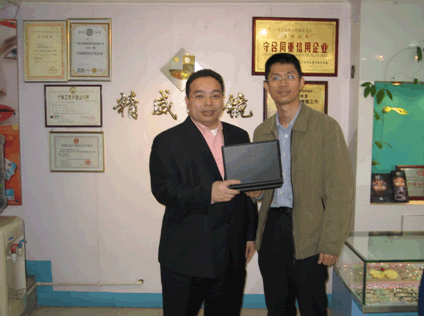 著名品牌精威眼鏡配鏡師正在使用小聰安全筆記本電腦左:廣州市海珠區人(ren)大代表、廣州精威眼(yan)鏡(jing)董(dong)事長徐廣紹