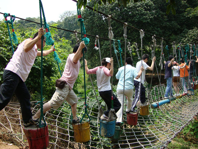 一路歡歌笑語很快就到了笑翻天。我們的教練很年輕,但非常威嚴,在教練的帶領下,三個團隊從最初的破冰訓練到出色的完成了天羅地網、突出重圍、空中鋼絲、踏籠飛渡等項目,并以卓越的團隊協作能力和對同事的信任以21人的成績出色完成了“孤島求生”這個項目。