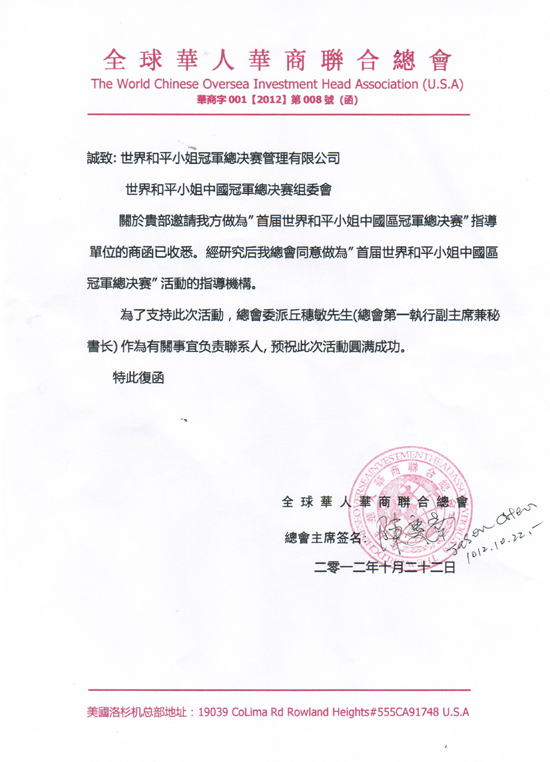 首屆世界和平小姐中國廣東省冠軍總決賽榮譽主席 周小聰先生榮譽主席 曹傳愿先生榮譽主席 周向東先生首席策劃師 葉劍飛先生相關下載:首屆世界和平小姐中國區冠軍總決賽報名表首屆世界和平小姐中國區冠軍總決賽報名條件選手報名登記表相關鏈接:世界和平小姐冠軍總決賽//www.mwp999.com熱烈祝賀中國慈善家金木堂投資集團董事長周向東先生認購5萬股,并出資5萬元支持世界和平小姐大賽廣州賽區慈善晚會晚宴!//www.mwp999.com/News_view.asp?id=100恭祝全球華人商會做為首屆世界和平小姐中國廣東省廣州賽區指導單位//www.mwp999.com/News_view.asp?id=99書畫大師王行書先生在簽約儀式中的講話//www.mwp999.com/News_view.asp?id=98為首屆世界和平小姐中國廣東省冠軍總決賽首席策劃師葉劍飛先生頒發聘書//www.mwp999.com/News_view.asp?id=97為首屆世界和平小姐中國廣東省冠軍總決賽榮譽主席曹傳愿先生頒發聘書//www.mwp999.com/News_view.asp?id=96為首屆世界和平小姐中國廣東省冠軍總決賽榮譽主席周小聰先生頒發聘書//www.mwp999.com/News_view.asp?id=95