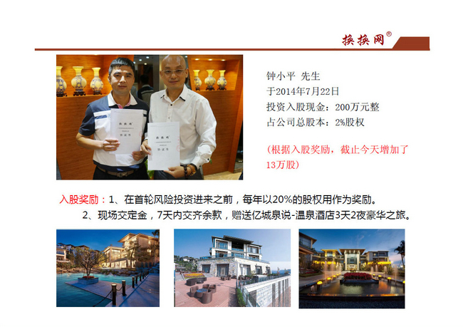 每(mei)股1元(yuan),每(mei)年回報20%(其中內部股權10%,現金(jin)收益(yi)10%,按(an)月支付),上市(shi)或風投進(jin)入退出