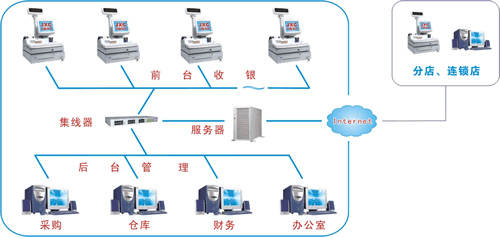 下(xia)圖為系統的架構圖。除了便捷的前臺POS功能,還有更加強(qiang)大的后(hou)臺進貨、銷售(shou)、倉庫、查詢等功能,還可以通過(guo)internet網絡實現(xian)遠程(cheng)傳輸功能,可管理(li)遠在異地的分店、連鎖店等。