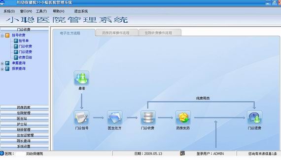 上圖為一個完整的局域網絡系統的基本架構。當然單機上也可以完成要做的所有事情,不過只能在一臺機上使用而已。另外,我們的系統還可以方便地實現遠程的互連,實現遠程的多個部門的協同工作,以及老板的遠程管理。 功能模塊介紹 · 門診收費管理: 門診掛號:建立患者資料,允許不掛號直接收費,支持刷卡掛號 門診收費:根據處方收費,支持不劃價直接收費,發票打印自定 門診退費:經藥房退藥后,進行門診退費 門診日結:支持多日一結或一日多結功能,報表反映的是至上次日結之后的所有收費情況,可以在每天下班或其它固定時間日結、上交財務部門。 · 患者資料管理: 患者詳細檔案管理 · 系統設置:用戶信息、醫生信息、科室資料、病區資料等 在小聰門診單機版基礎上增加的功能模塊 · 藥房管理:中藥房、西藥房、中成藥等門診藥房和住院藥房的調拔、發藥、退藥、科室領用、報損出庫等 · 藥(yao)庫(ku)管理:支持中藥(yao)庫(ku)、西藥(yao)庫(ku)等多藥(yao)庫(ku)管理