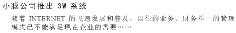 客戶流: 根據財務(wu)流確定的客戶情況提供網(wang)(wang)(wang)上(shang)查(cha)詢,信息(xi)發布、產(chan)品訂單、公司(si)、產(chan)品、宣傳(chuan)、遠程查(cha)詢等,客戶信息(xi)再通過(guo)網(wang)(wang)(wang)上(shang)留言(yan)返回信息(xi)流,由小聰(cong)外(wai)部網(wang)(wang)(wang)軟件來完成(cheng)(INTERNET),屬于(yu)電子(zi)商(shang)務(wu),已有(you)現(xian)成(cheng)的軟件。