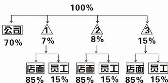 二級加盟店每發展一家三級加盟店,按加盟費0.75:0.10:0.15比例分配;