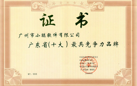 2006年8月28日,廣州市小聰軟件有限公司被廣東省百強品牌推廣活動組委會評為“廣東省(十大)最具競爭力品牌”