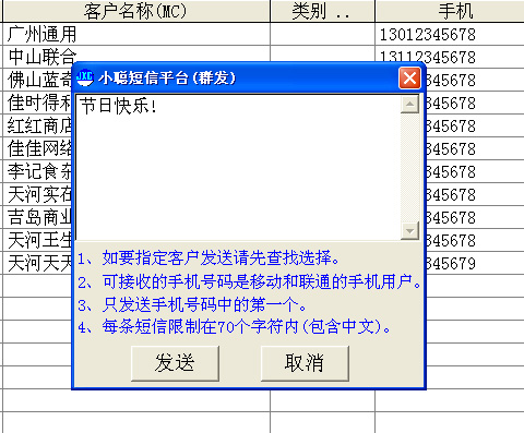 好消息!小聰軟件通用版經過升級開發,己成功與短信平臺無縫連接。用戶只需升級安裝新版本的通用版軟件并向小聰總部開通短信帳號,你就可以感受到對客戶的群發及送貨通知等商務短信功能帶來的方便快捷。推廣期間短信優惠價格為8.5分/條。歡迎各界人士下載試用。