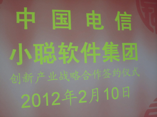 2012年2月10日,中國(guo)電信與(yu)小聰(cong)軟(ruan)件集團創新產業(ye)(ye)戰略合(he)作正(zheng)式簽約(yue)。雙方經友(you)好協(xie)商,決定建(jian)立戰略合(he)作伙伴(ban)關系,攜手共進。 雙方的合(he)作內容包括:小聰(cong)產業(ye)(ye)園所(suo)有應(ying)用(yong)業(ye)(ye)務、信息化推廣(guang)、云應(ying)用(yong)、虛擬主(zhu)機應(ying)用(yong)、網(wang)眼設備推廣(guang)等(deng)。