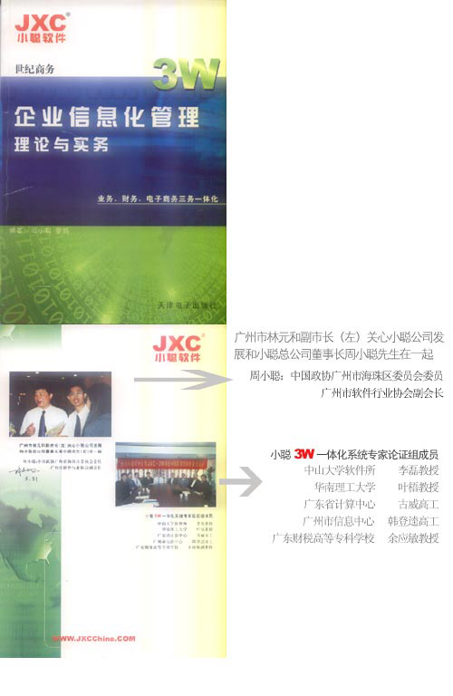 《企業信息化管理理論與實務2003》一書在廣州市海珠區科技局、廣州市科技局、廣州市副市長林元和同志等各級領導關懷和支持下,2003年新版由天津電子出版社出版了。這是繼“小聰3W一體化系軟件”榮獲廣州市2002年科技獎后又一喜訊。 本書是一本企業信息化管理理論性與實際性完美結合的實用型教科書,也可以作為實際用戶手冊。本書光盤內容適用于計算機應用學,企業管理學,會計學和信息管理學專業的老師、學生,自學者和企管工作者,軟件用戶以及從事商務軟件開發的系統分析人員、程序員,還有計算機管理學的理論研究人員,作為操作手冊和參考研究素材。 本書由周小聰、廖鵬主編,李凱強、申鋒、何巧茹、李學明、周思敏、余沐生、朱小明、譚延慧、夏艷、陳漢強、林建鋒、區釗強、梁志廣、包傳康、周美初、梁四根、杜宏霞 、施鴻卯等人在編寫過程中付出了辛勤的勞動,得到中山大學嶺南學院及計算機研究所等專家教授的指導,同時還得到廣州市科技局馬小明女士、《電腦報》天極公司副總裁楊濤先生、美國國際大學(AWU)林國華先生的指導和幫助,在此一并致謝。 本書價格68元,隨書附學習光盤,歡迎購買,也可直接向本公司郵購。