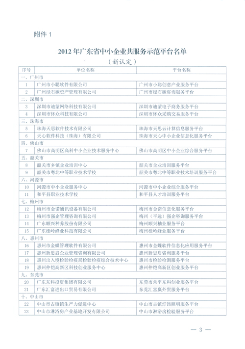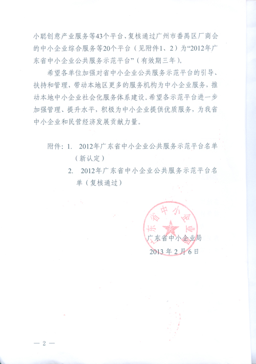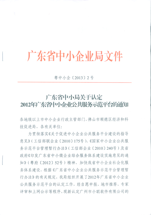 根據廣東省中小企業局中小企[2013] 2號文件的通知,“廣州市小聰創意產業服務平臺”被 廣東省中小企業局認定為“2012年廣東省中小企業公共服務示范平臺”,特此公告。 感謝大家對“廣州市小聰創意產業服務平臺”的重點關注和大力支持!