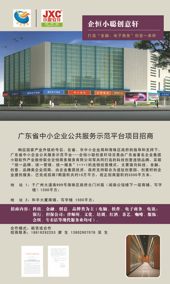 響應國家產業升級的號召,在省、市中小企業局和海珠區政府的指導和支持下,廣東省中小企業公共服務示范平臺---企恒小聰創意軒項目是由廣東省著名企業集團小聰軟件產業股份聯合企恒商務服務有限公司等共同打造的科技創意連鎖品牌,采取“統一品牌、統一管理、統一服務”1+1+1的連鎖經營模式,主要面向科技、金融、創意、品牌類企業招商,由企業集團投資、政府支持聯合為進駐創意園、創意軒的企業提供服務,已完成招商7期面積共約10萬平方,現正招商面積約3500平方米。 地址1:于廣州大道南999號海珠區政府北門對面(閩南公館樓下一層商鋪、寫字樓)1500平方; 地址2:和豐大廈商鋪、寫字樓 1500平方; 招商內容:科技、金融、創意、品牌類為主(電腦、軟件、電子商務、電訊;銀行、擔保公司;律師所、文化、培訓、紅酒、茶藝、咖啡、服飾、會所、專賣店等現代服務業均可)。 簽約期:1-10年; 合作模式: 租賃或合作 招商聯系(xi):18819292253廖生(sheng) 13802907078吳生(sheng)