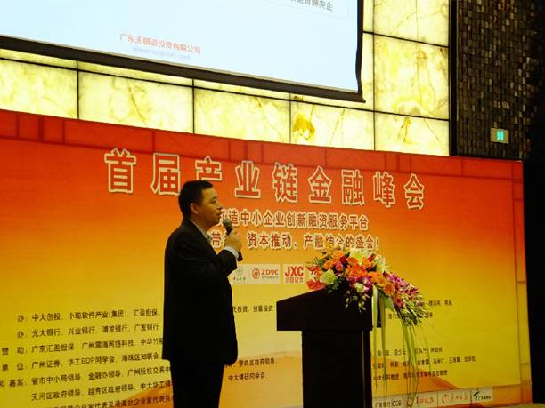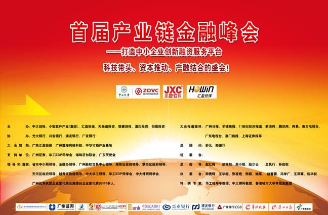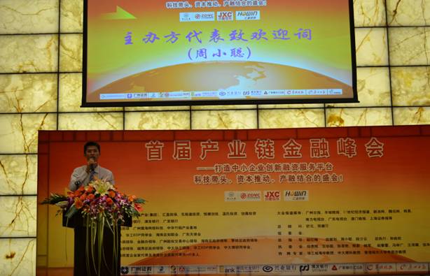 9月5日(ri),首屆產業(ye)鏈(lian)金融峰會在廣州國際(ji)金融中(zhong)心(xin)四季酒店舉(ju)行(xing),主(zhu)辦方(fang)代(dai)表小(xiao)聰(cong)軟(ruan)件(jian)產業(ye)(集團(tuan)(tuan))代(dai)表周小(xiao)聰(cong)董事長致(zhi)歡迎辭。中(zhong)大(da)創投、小(xiao)聰(cong)軟(ruan)件(jian)產業(ye)(集團(tuan)(tuan))、無(wu)極道投資(zi)、匯盈擔(dan)保、恒建創投、溫氏投資(zi)、創晨投資(zi)作為大(da)會主(zhu)辦方(fang),邀請了來自經貿(mao)、文(wen)化、IT、醫藥等各個行(xing)業(ye)的優(you)秀民營(ying)企業(ye)家代(dai)表及港(gang)澳臺企業(ye)家共300多人出席了此(ci)次峰會。
