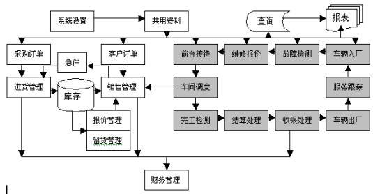 3.車輛檔案/維修項目工時費管理/前臺開單/維修車間調度/維修領料/返修處理/年季審統計與提醒/完工總檢/結算收銀/服務跟蹤 |